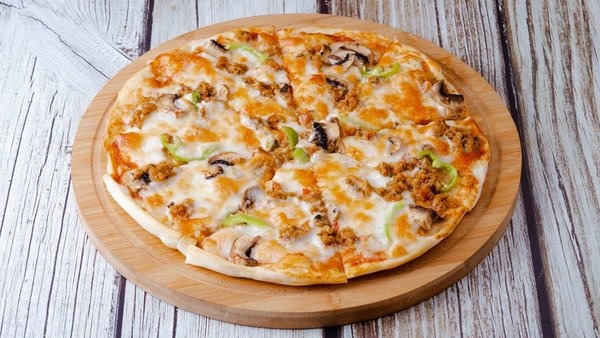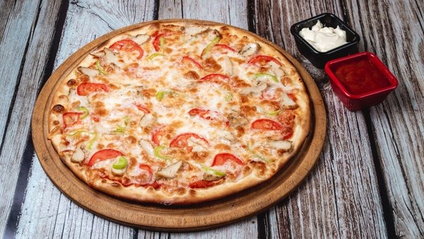 Sous, pendir, toyuq əti, kolbasa, sosiska, göbələk, bibər, pomidor, zeytun