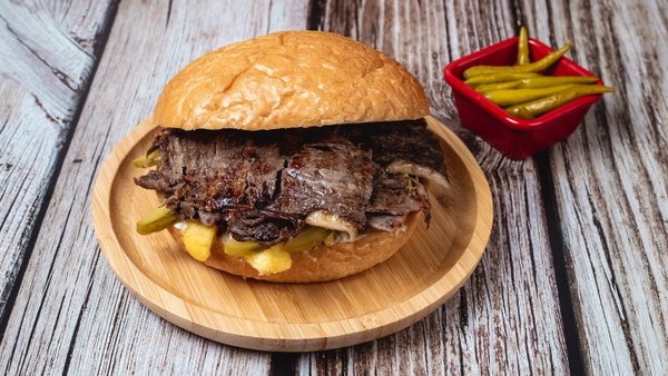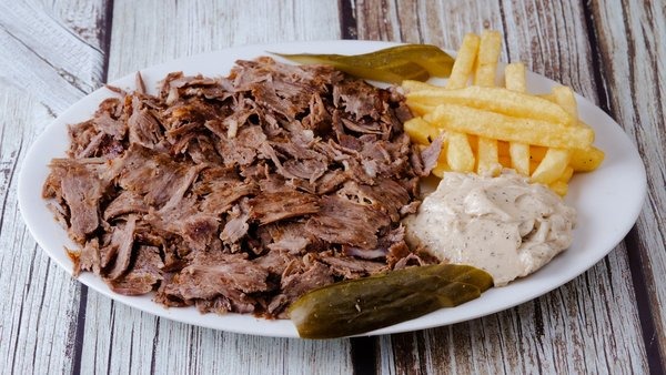 Mal əti, sarımsaqlı sous, fri, xiyar turşusu, çörək
