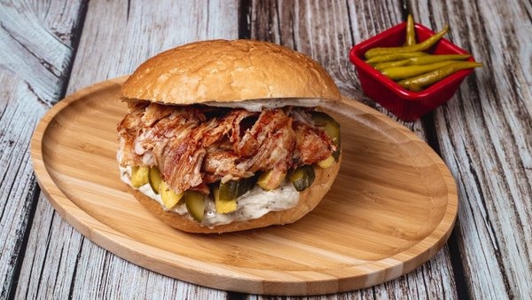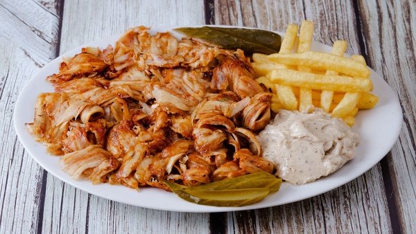 Toyuql əti, sarımsaqlı sous, fri, xiyar turşusu, lavaş
