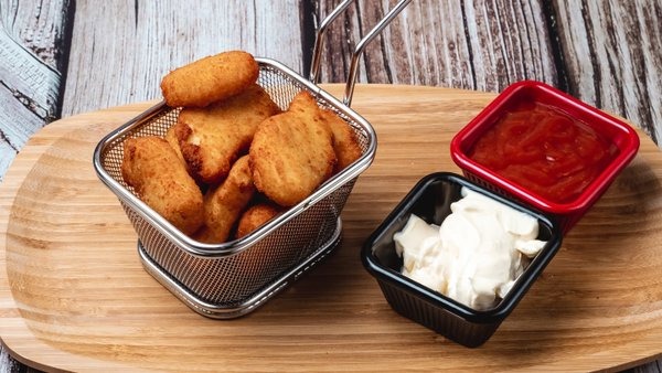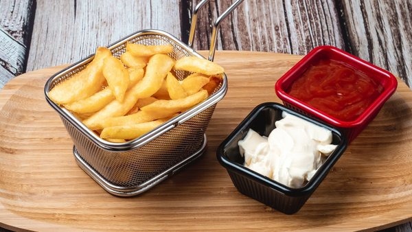 Toyuq əti, sarımsaqlı sous, fri, xiyar turşusu, çörək